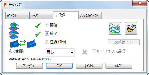 カーブ / サーフェス選択 - ドロップダウンリストから カーブ、または、サーフェス を選択すると、このオプションがアクティブになります。 オプションを選択して、適切なリミットカーブ、または、リミットサーフェスを選択します。適切に選択すると、 アイコンが