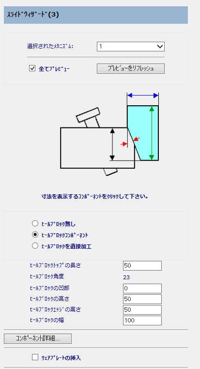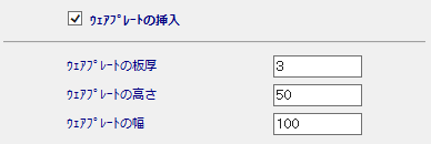- ヒールブロック前面にウェアプレートをあてる場合、ウェアプレートの挿入 を選択して ウェアプレート厚さ、ウェアプレート高さ、ウェアプレート幅 を入力します。