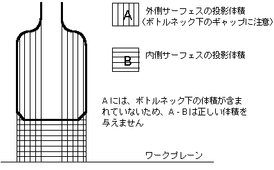 投影がどのように結果に影響するかを示す良い例として、ここではボトルを取り上げます。ワークプレーン(上方フェーシングの下の体積)の上に直立させる場合、外側サーフェスにはネック部分は含まれません。上方フェーシング内側サーフェスの下の体積がそこから減算されると、結果はボトルの容量にはなりません。