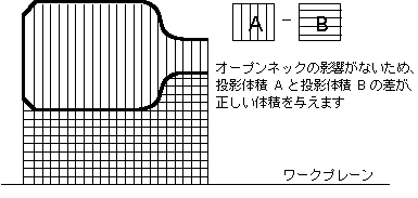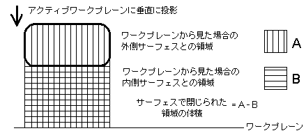 平坦な開いた領域を持たない複雑なカーブを持つ開いたサーフェスでは、ワークプレーンに相対するサーフェスポジションによって、計算された値が異なることを認識する必要があります。可能な場合、投影体積を計算する前に全てのサーフェスを閉じるか、アクティブワークプレーンを構成することで、開いた部分がワークプレーン上にあるか、ワークプレーンと垂直になるようにします。