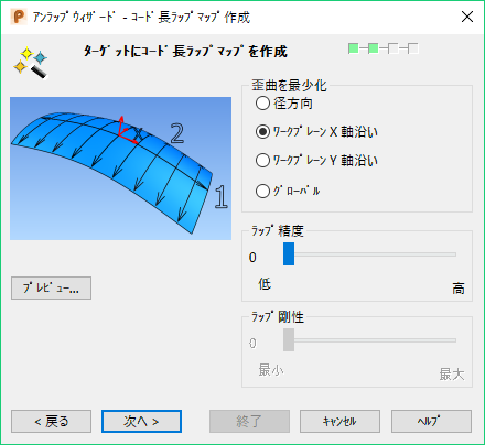 - 歪みを最少化 - アンラップ処理で生じた歪みを最少化する箇所を選択します。 次のいずれかを選択します。