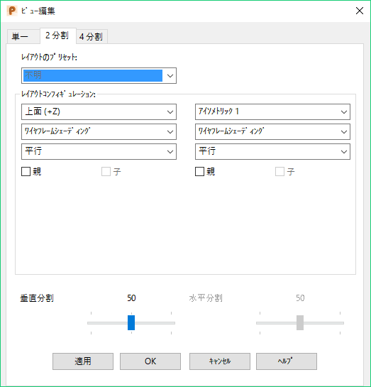 タブを選択すると、ダイアログに、各ビューで利用可能なオプションが示されます。例えば、2 分割 タブを選択すると、ダイアログにはその 2 つのビューのオプションが示されます。