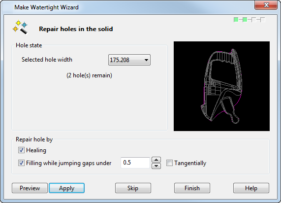 適用 - 次の大きい孔の処理に進む前に、現行隙間埋め設定を使用して選択孔を修正します。