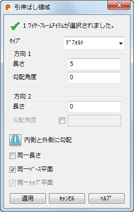 - 引伸ばしの 長さ (方向 1) を入力します。 方向 2 で指定される長さが 0 でない場合に、引伸ばしの長さを 0 に設定することができます。