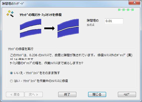 警告ダイアログで OK をクリックするとウィザードに戻るため、隙間埋めトレランス を変更することができます。再び 終了 を選択すると、指定トレランスに対する修正が失敗した場合は更なる警告が表示され、それ以外では ウィザードの結果 ページが表示されます。