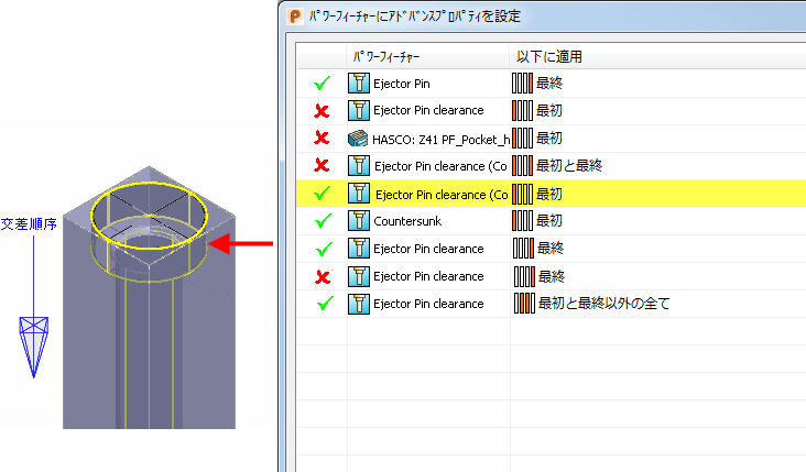 [パワーフィーチャにアドバンスプロパティを設定]ダイアログを使用して、パワー フィーチャーの交差ルールを変更します。