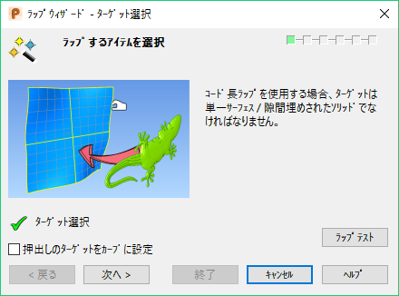 ラップテスト - 選択ワイヤーフレームとターゲットオブジェクトのラップテストを作成し、ラップウィザード で作業を進める前にラップの結果を確認することができます。