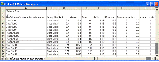 Material name、Group Name、Red、Green、Blue、Polish、Emission、Translucency、reflect、shader_scale