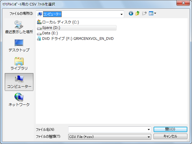 このダイアログを使用して、.csv ファイルを選択し、マテリアルデータをデータベースにインポートします。
