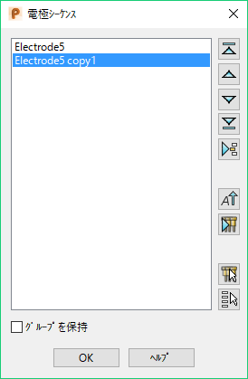 電極をグループ化 - 電極のコピーを、リスト内におけるそのピアグループの最初のアイテム以下に配置します。 リストから電極を選択した場合、選択した電極が属するピアグループのみがグループ化されます。