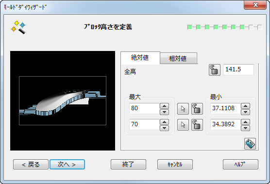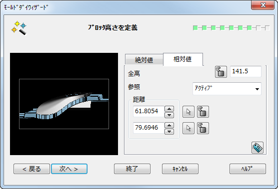 [ブロック高さを定義]ページを使用して、2 分割されたダイ ブロックの高さを指定します。ブロックの高さは、絶対値または相対値を使用して指定することができます。