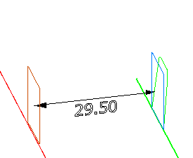 青い平面は参照を、その他平面はスライドコアの延長を表示します。モデル上の寸法は、2 つの平面間の距離になります。
