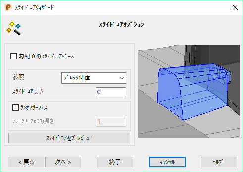 勾配 0 のスライドコアベース オプションを選択した場合、スプリットサーフェスの修正の必要はないため 終了 のみが選択可能になります。