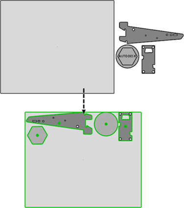 次図の例では、アイテムは、3 つの別のパーツとしてネスティングされます。整理済みパーツの場合を除いて、元の相対位置は保持されません。円弧、ポリゴン、およびテキスト アイテムはアイテム同士の相対的位置を保持し、単一パーツとして登録されます。