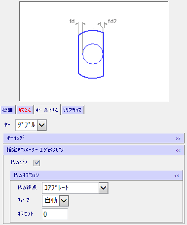 [キー & トリム]タブには、プレーンまたは段付きのブレード エジェクタ ピンとエジェクタ スリーブで利用可能な、シングル スロットまたはダブル スロットのキー ピンのパラメーターが表示されます。作成中のコンポーネントタイプを反映したパラメーターが表示されます。