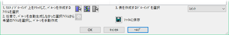 表 ダイアログの下半分には、表で選択したドローイングの作成用アイテムに、バルーンとラベルを適用するための操作手順とオプションが含まれています。