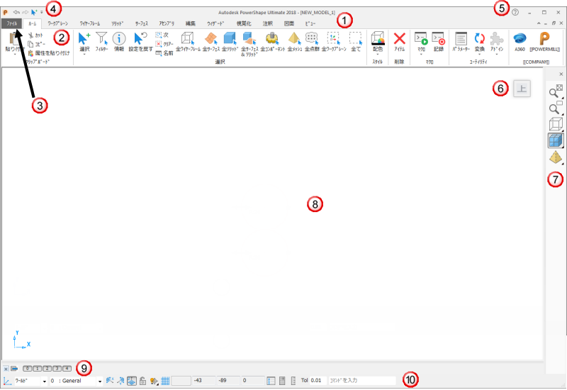 PowerShape は、リボンとタブで構成されている Windows 形式のインタフェースを使用しています。画面には、次の領域があります。
