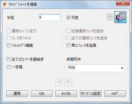 アイコンをダブルクリックすると、[ソリッドフィレットを編集]ダイアログが表示されます。
