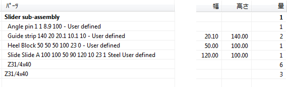 - コンテキストメニューから、展開 を選択します。表の、サブアセンブリの名前以下に、サブアセンブリアイテムが個別に表示されます。個別のアイテムは、インデント付きで表示されています。
