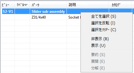 表内のサブアセンブリエントリーを右クリックして、コンテキストメニューを表示します。