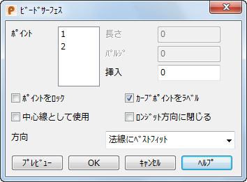 プレビュー - 指定されたパラメーターを使用してサーフェスを表示します。表示されたサーフェスが不適切な場合はパラメーターを変更し、再び プレビュー をクリックします。ポイント 1 の方向表示を使用して、バルジの方向を反転することができます。