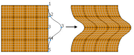 リミットカーブ、または、サーフェスへの距離が近ければ近いほど、ポイントの移動は減少します。選択カーブ、または、サーフェスを超過するポイントは移動しなくなります。カーブ、または、サーフェスは参照カーブを横切ることはできません。