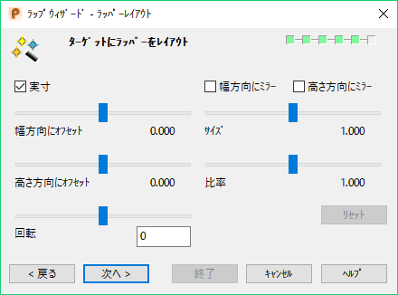 ワイヤーフレームラッパーが、ターゲットサーフェス、または、ソリッドに投影されます。 スライダーの移動に伴い、投影されたイメージも変化します。 値は、投影領域の割合になります。
