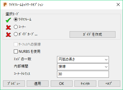 [ネットワークから]、[個別のワイヤーフレームから]、または[ドライブカーブ]オプションを使用している場合に、高度なサーフェス作成オプションを指定するには、[スマートサーフェス]にある[アドバンス]をクリックすると、高度なオプションのダイアログ([ワイヤーフレームネットワークオプション]ダイアログなど)が表示されます。