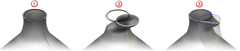 この方法を使用すると、モデル上またはモデル周囲のカーブをスケッチし、そのカーブを歪曲してモデルの形状を変更できます。または、2 つのカーブを選択します。 カーブによるモーフィングでは、ポイントを使用する方法と比較して、作成したバルジの形状をより精密にコントロールすることができます。
