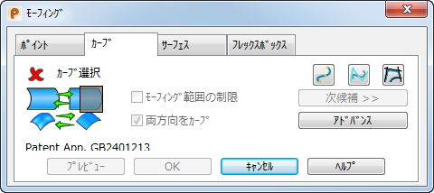 - [アドバンス]をクリックすると、モーフィングに使用する 2 つのカーブを個別に選択できる追加オプションが表示されます。カーブ、または、サーフェスを使用して、モーフィング領域を制限することもできます。