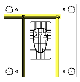 冷却孔作成ウィザードを使用すると、モールドに冷却管を作成できます。冷却管を使用すると、モールド全体に冷媒を循環することができ、均一かつ急速に冷却されます。次のモールドでは冷却管の例が強調表示されています。
