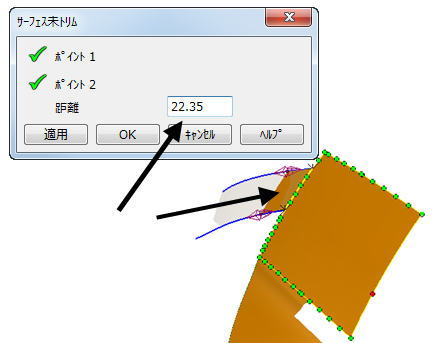 - ダイアログに 距離 を入力します。 距離 はサーフェスの延長沿いに計測される実際の距離で、投影された距離ではありません。
