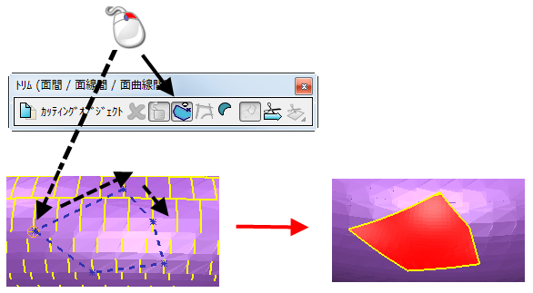 - オブジェクトを選択して、ツールバーから トリム(面間 / 面線間 / 面曲線間) を選択します。