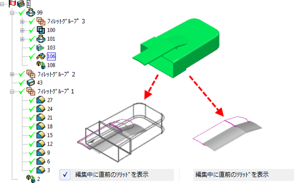 - 編集中に直前のソリッドを表示 - フィーチャーの編集中にソリッド全体を表示します。 つまり、フィーチャーを編集中に、ソリッドツリーの上部にあるフィーチャーを確認することができます。このオプションは、デフォルトで選択されています。次図は、ソリッド増厚 106 の編集中にこのオプションを使用した結果を示しています。