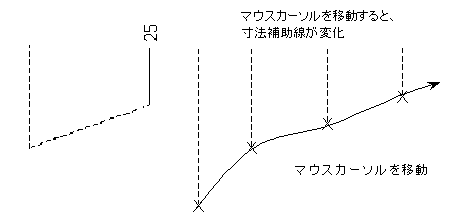 該当のポイントとカーソル間に、ラバーバンド寸法補助線が表示されます。マウスの移動に伴い、寸法補助線が変化します。