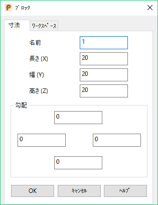 プリミティブの寸法を編集するには、[寸法]タブを使用します。編集可能な寸法は、選択したプリミティブのタイプによって異なります。例 えば、次のダイアログはプリミティブブロックで表示されます。