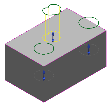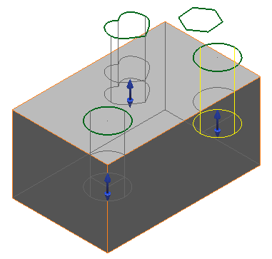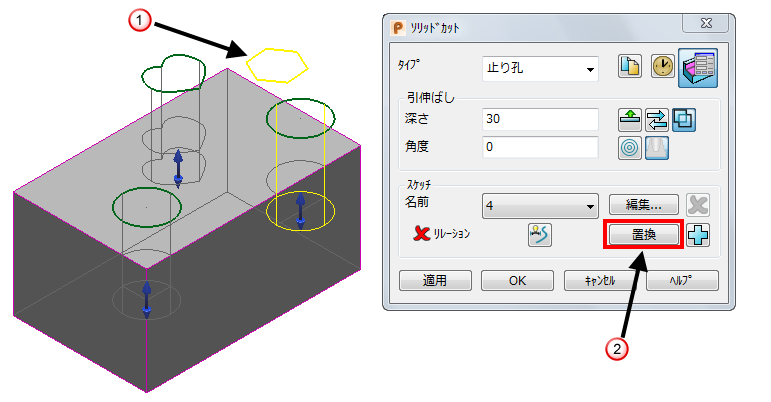 - 適用 をクリックして、置換ワイヤーフレームを使用してカットを再作成します。置換えられた引伸ばしソリッドのワイヤーフレームはモデル内に残されます。