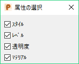 このオプションを使用して、選択オブジェクトの属性を他のオブジェクトに貼り付けます。 スタイル、レベル、透明度、マテリアル 属性を貼り付けできます。