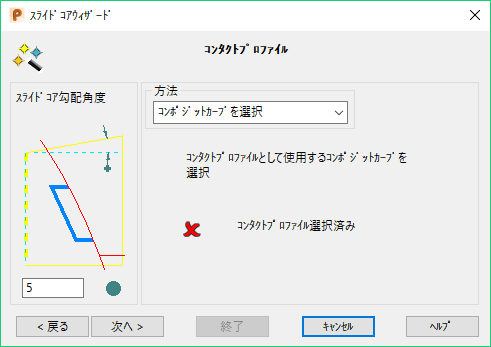 コンポジットカーブは、ダイインサート上に配置されていなくても構いません。ウィザードは、そのカーブを Z 軸沿いにダイインサートに投影してコンタクトプロファイルを作成します。