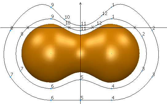 この例では水平軸を使用します。参照カーブと 3 回以上交差している、この軸に垂直な平面はありません。