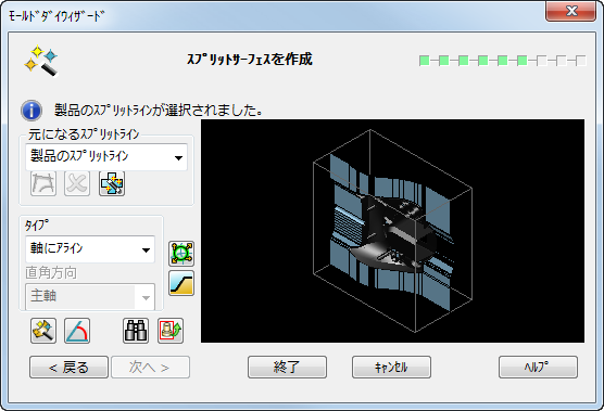 はい - ステップスプリットサーフェスダイアログが再表示され、キャビティインサートの第 2 サーフェスを作成することができます。