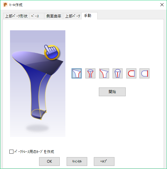 手動 タブを使用して、ヒール上のカーブを編集します。