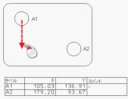 オブジェクト(円の中心など)上のポインターをクリックすることによってバルーンを作成すると、ポインターの位置と円の中心は関連付けられます。円の中心を移動すると、バルーンの座標は表内で更新されます。