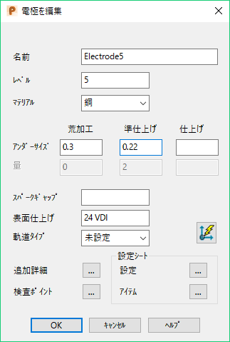 をクリックして、追加の電極詳細 ダイアログを表示します。 このダイアログを使用して、設定シートに表示される追加情報を更新することができます。