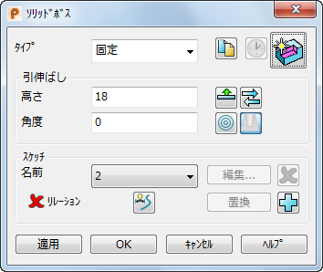 をクリックして ソリッドフィーチャーリレーション ダイアログを表示します。このダイアログを使用して、ソリッドに対するフィーチャーの相対位置を定義することができます。リレーション の状態が次のいずれかで示されます。