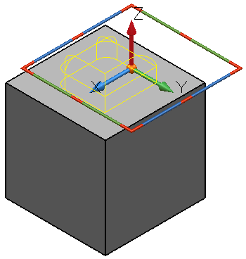 別の設定を選択すると、選択に応じてワークプレーンが指定されます。次の例では、ワークプレーンがポケット / ボスの左端中央に配置されています。