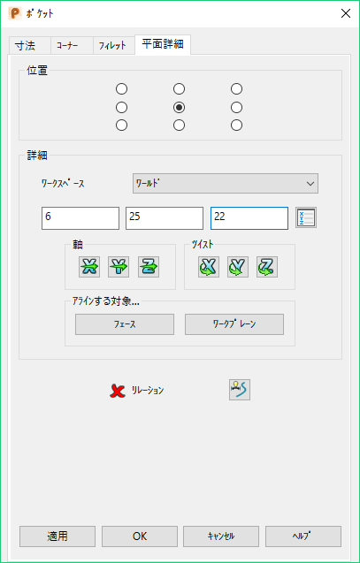 [位置]: フィーチャー上のワークプレーンの位置は、このパネルを使用して定義されます。