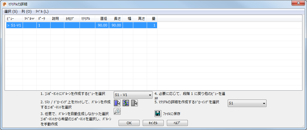 - マテリアルの詳細をドローイング上に作成、または、ファイルに保存します。