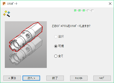 - [可視]: 画面に表示されているアイテムをエクスポートします。非表示になっているアイテムはエクスポートされません。このオプションは、モデル付きのワークプレーンをエクスポートする場合に便利です。