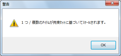 選択アイテムにスケール拘束がある場合に、[編集]タブ > [変換]パネル > [スケール]を使用して、複数のオブジェクトをスケールすると、次の警告メッセージが表示されます。